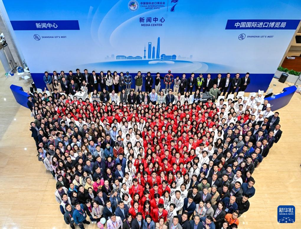 11月10日,志愿者及工作人员在新闻中心摆出数字“7”的造型。新华社记者 张铖 摄