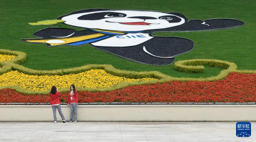 11月10日,志愿者在国家会展中心(上海)南广场留影。新华社记者 徐亮 摄