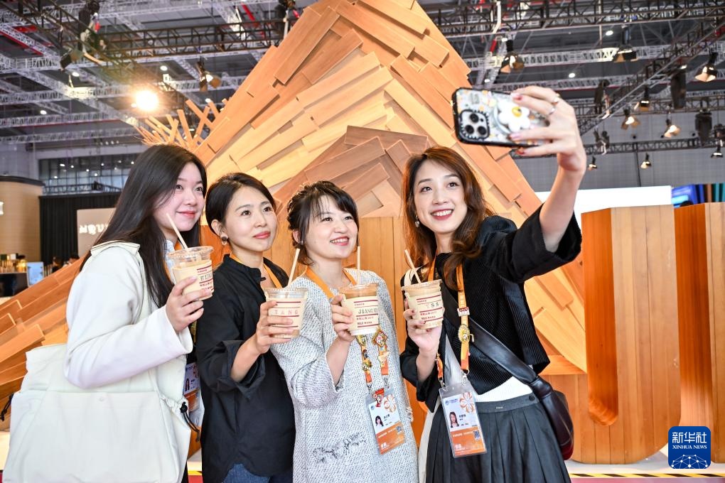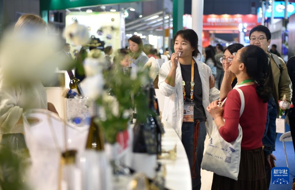 11月10日,参观者在第七届进博会食品及农产品展区品尝饮料。新华社记者 鲁鹏 摄
