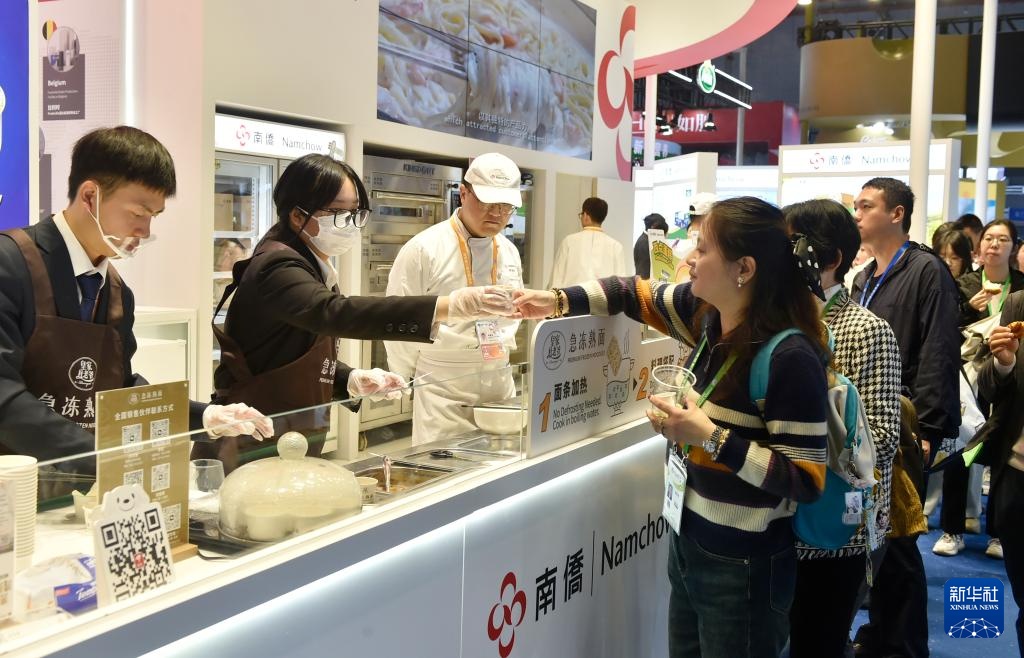 11月10日,参观者在第七届进博会食品及农产品展区品尝美食。新华社记者 鲁鹏 摄