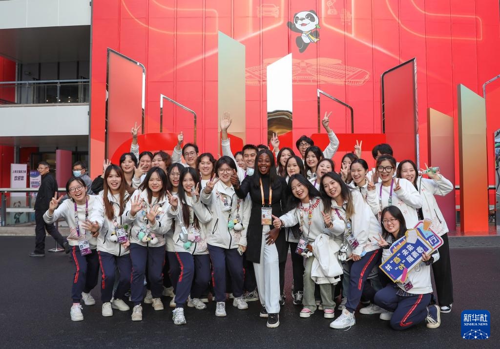 11月10日,来自尼日利亚的参展人员与志愿者在国家会展中心(上海)合影。新华社记者 杜潇逸 摄