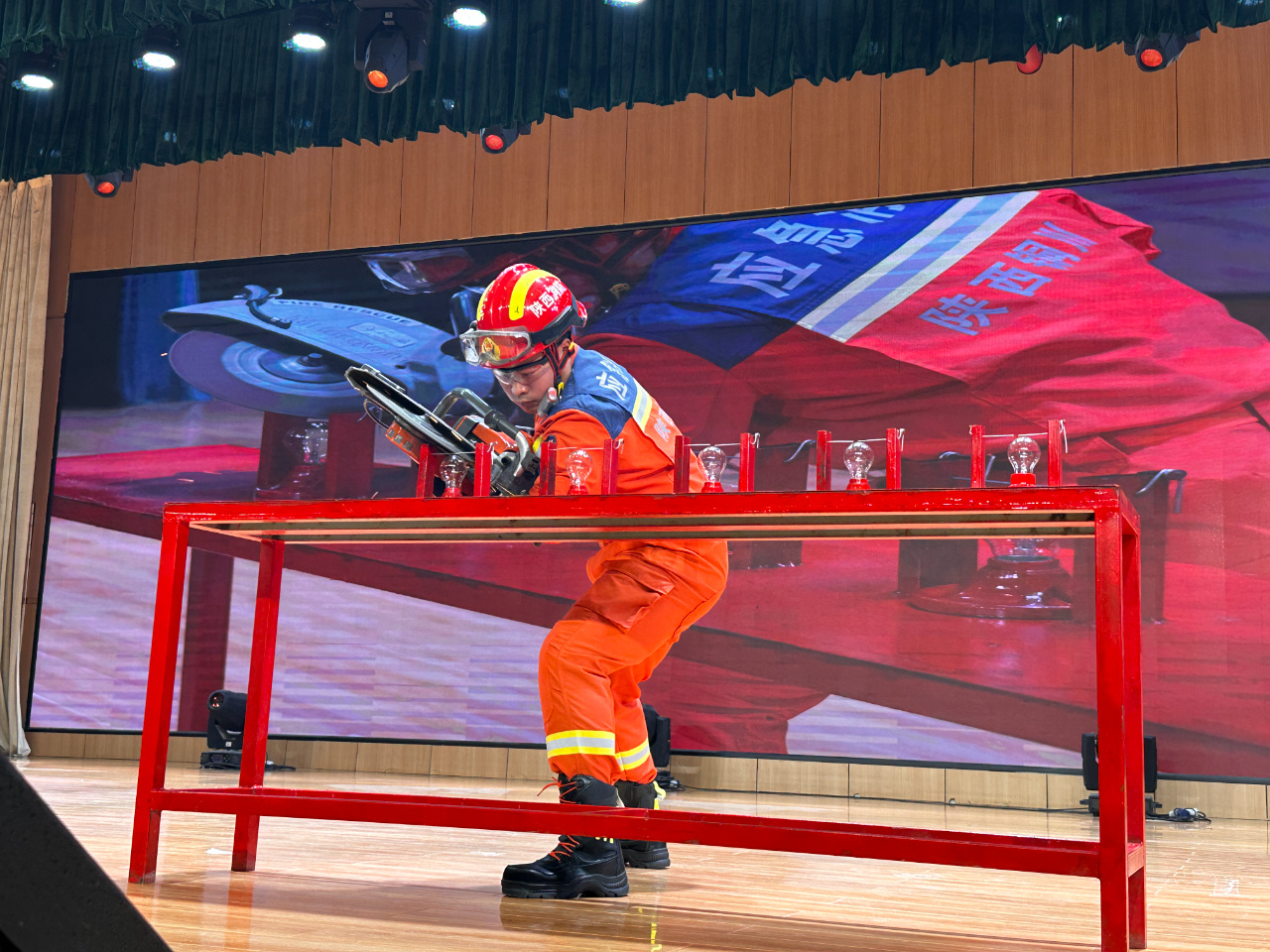 技能人才进校园活动现场,中国兵器西北工业集团大国工匠张新停,全国劳动模范徐保凤分别为500余名师生做了精彩的宣讲。张新停,陕煤集团神南产业公司神南救护大队郭明、贺瑞强,铜川市消防救援支队高瑞东现场进行了气球上为A4纸钻孔、“生命柱”精准起伏绝技等绝活展示。