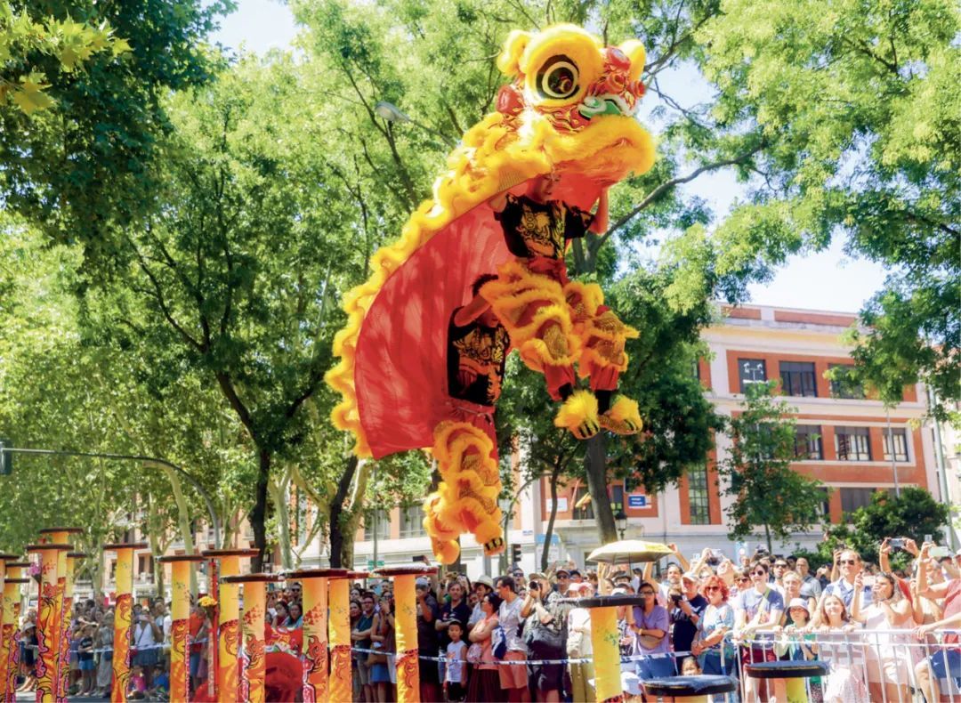 当地时间2023年8月6日,西班牙马德里,中国舞蹈演员和杂技演员表演舞狮。