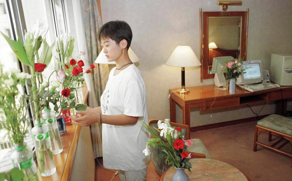 1999年9月6日,“72小时网络生存测试”在京、沪、穗三地顺利结束,在广州完成测试的张春楠在欣赏她通过网络购得的鲜花。 新华社记者 刘彦武 摄