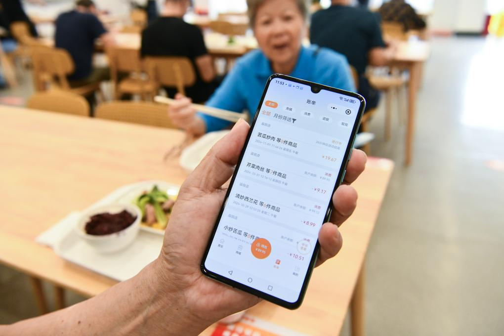 2024年11月1日,在深圳市福田区益田社区数字食堂,来就餐的老人展示手机上的自动结算记录。老人们通过小程序进行用户注册后,就餐时可实现通过AI人脸识别、自助称重计价、即时无感支付。新华社记者 梁旭 摄