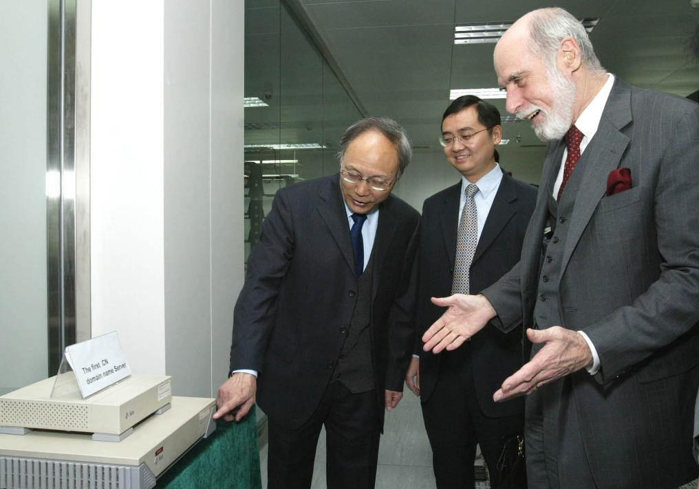 2004年4月15日,被誉为“互联网之父”的文顿·瑟夫(右)到访中国互联网最早的全功能接入地中科院计算机网络信息中心,他参观了中国第一台全功能接入国际互联网的路由器和第一台CN域名服务器。新华社记者 刘宇 摄