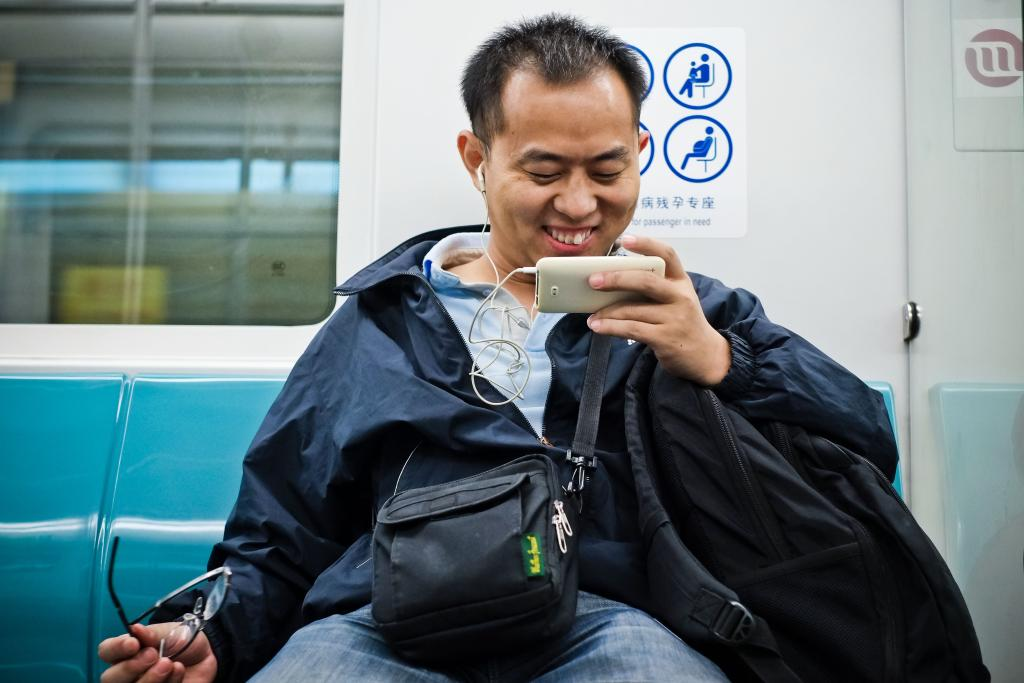 2012年10月12日,在北京地铁4号线列车上,一名男子在用手机观看视频。新华社记者 张铖 摄