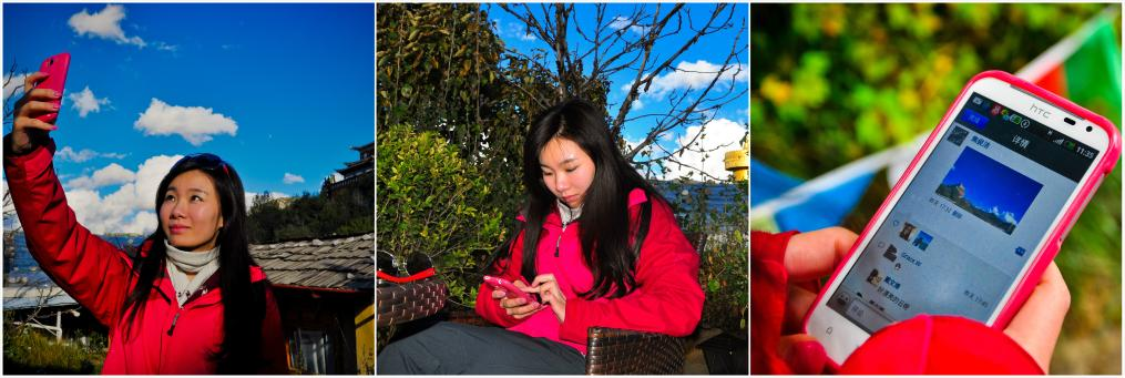 2013年10月,一名游客在云南香格里拉独克宗古城的一家客栈里使用微信朋友圈分享自己的旅途见闻。新华社记者 王婧嫱 摄