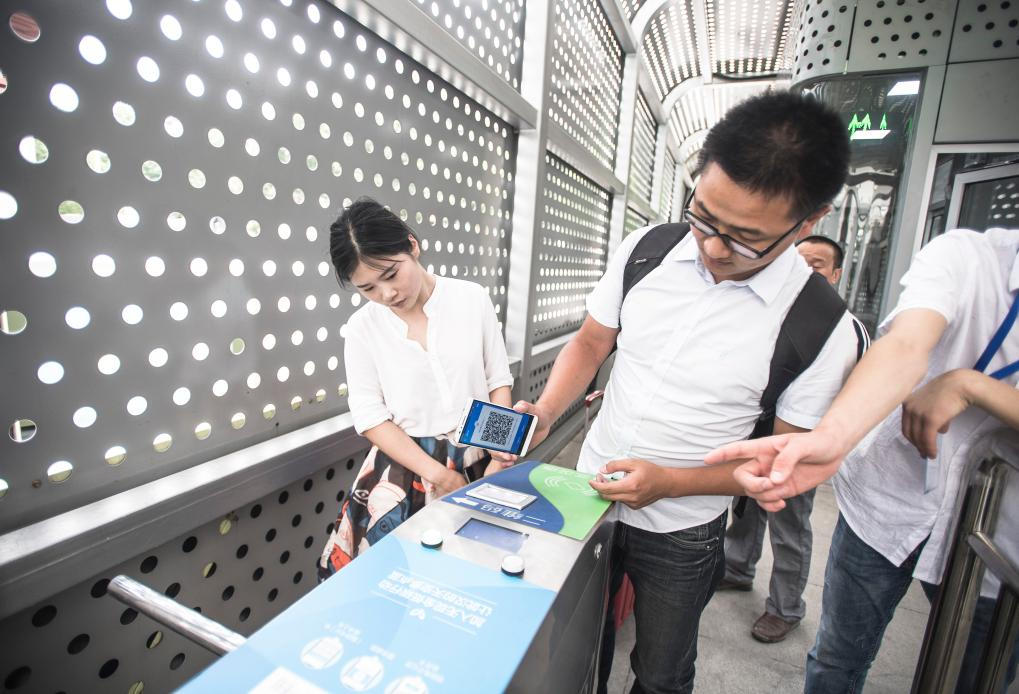 2017年6月14日,乘客在武汉BRT武昌站刷支付宝进站乘车。新华社记者 肖艺九 摄