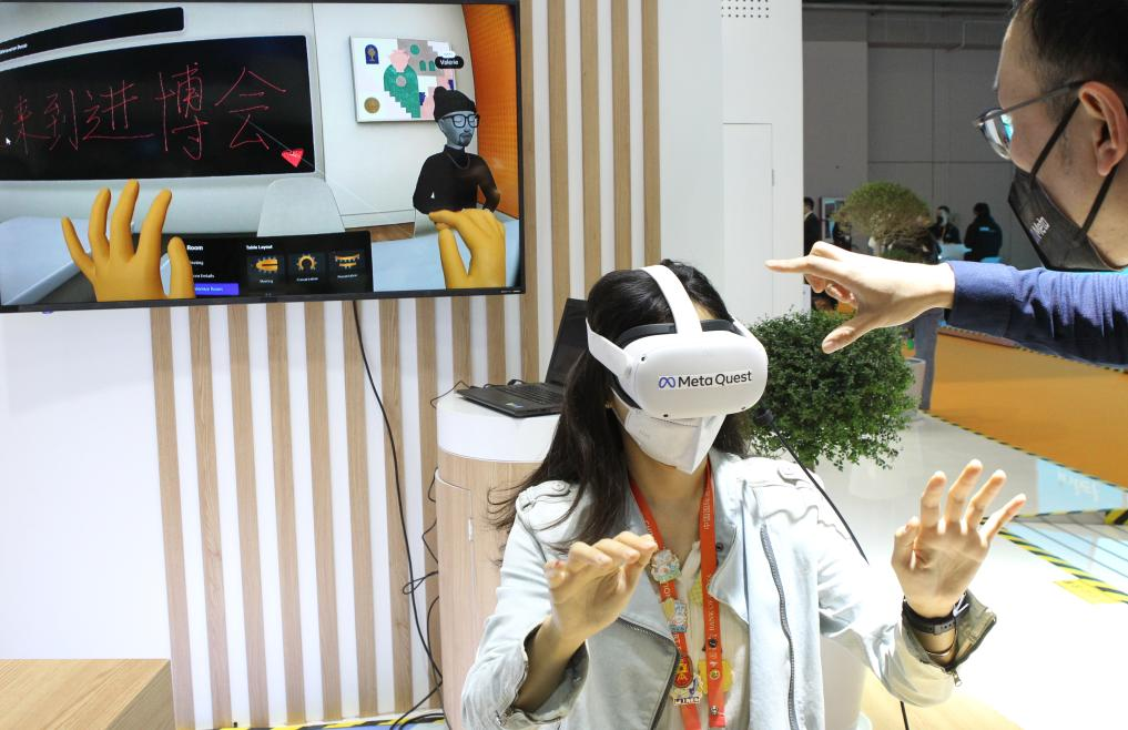 2022年11月7日,在第五届进博会技术装备展区的人工智能专区,一名媒体工作人员借助VR头戴设备体验虚拟工作空间“元宇宙”交互应用。新华社记者 侯俊 摄