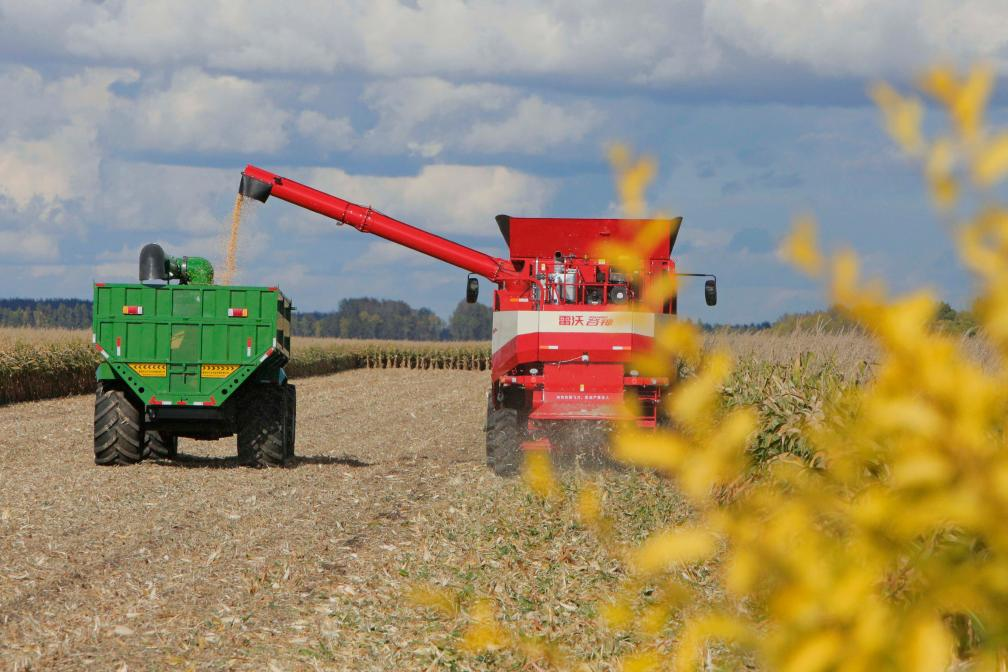 2024年9月27日,无人驾驶农机在黑龙江省友谊县的一处玉米种植地块进行秋收作业。新华社记者 石枫 摄