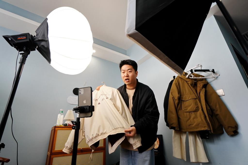 2024年11月15日,创业者在河北省石家庄市新华区奥火创业孵化基地内直播销售服装。新华社记者 牟宇 摄
