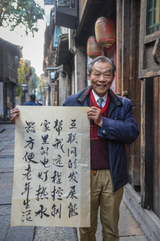 2014年11月20日,在首届世界互联网大会乌镇峰会期间,乌镇退休居民高明忠展示他对未来互联网生活的畅想,“互联网的发展能帮我远程控制家里的电灯、热水器,方便老年生活。”新华社记者 徐昱 摄