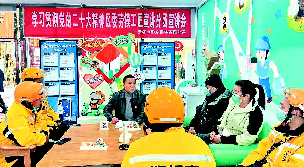 省级劳模鲁成贵在“小哥驿站”宣讲党的二十大精神 乐山市总工会供图
