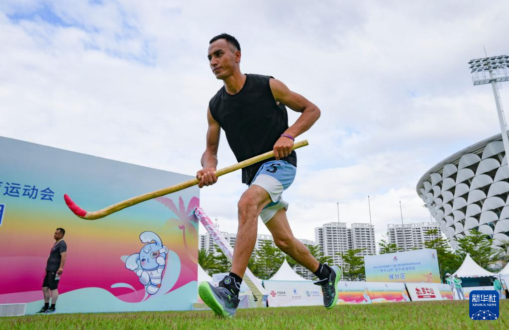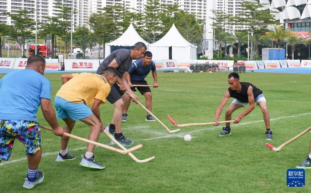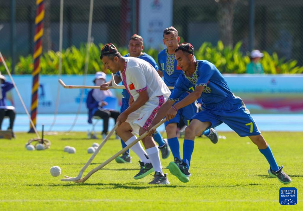 这是11月24日,在三亚市体育中心举行的第十二届全国少数民族传统体育运动会室外表演项目中,新疆队球员阿卜杜拉艾孜则·阿卜杜海娃尔(前右)在麦热球表演中。新华社记者 陈朔 摄
