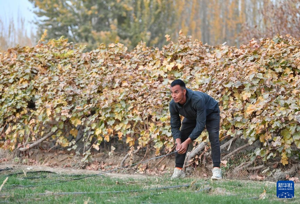 这是11月8日,在新疆于田县先拜巴扎镇萨依巴格村,阿卜杜拉艾孜则·阿卜杜海娃尔在冬小麦田间检查滴灌带。新华社记者 胡虎虎 摄