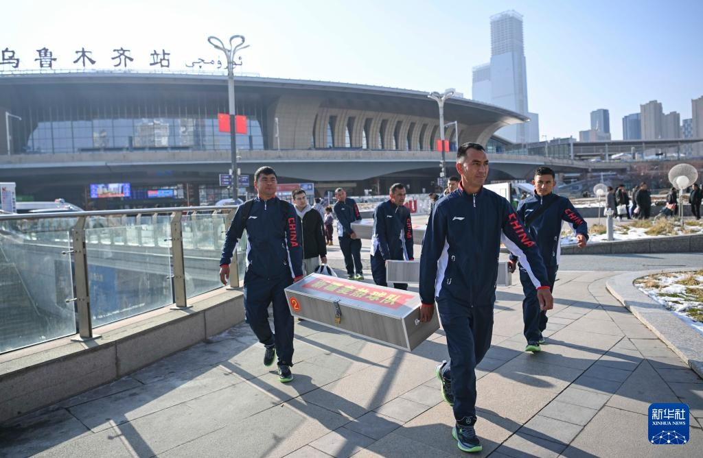 这是11月17日,阿卜杜拉艾孜则·阿卜杜海娃尔(前右)和队友携带比赛装备从于田抵达乌鲁木齐站。新华社记者 胡虎虎 摄