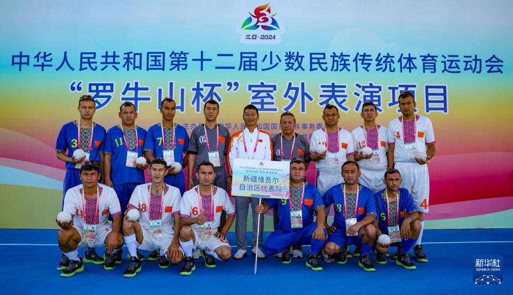 这是11月24日,在三亚市体育中心,新疆麦热球队成员在第十二届全国少数民族传统体育运动会室外表演项目开始前合影。新华社记者 陈朔 摄