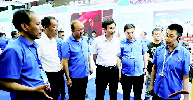 中阳县委书记王峰(左四)在听取中阳钢铁有限公司职工的讲解