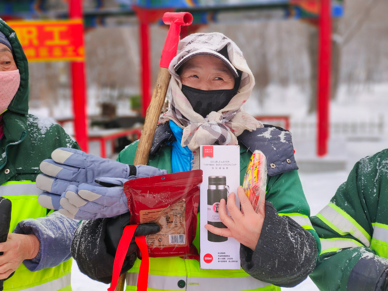 11月27日下午,齐齐哈尔市铁锋区总工会购置手套、保温杯、红糖、即热帖等防寒用品,为100余名环卫职工构筑起应对风雪冰冻天气的暖心屏障。环卫工人单大姐说:“这么大的风雪,这么低的温度,手套和暖帖都很实用、很贴心。”