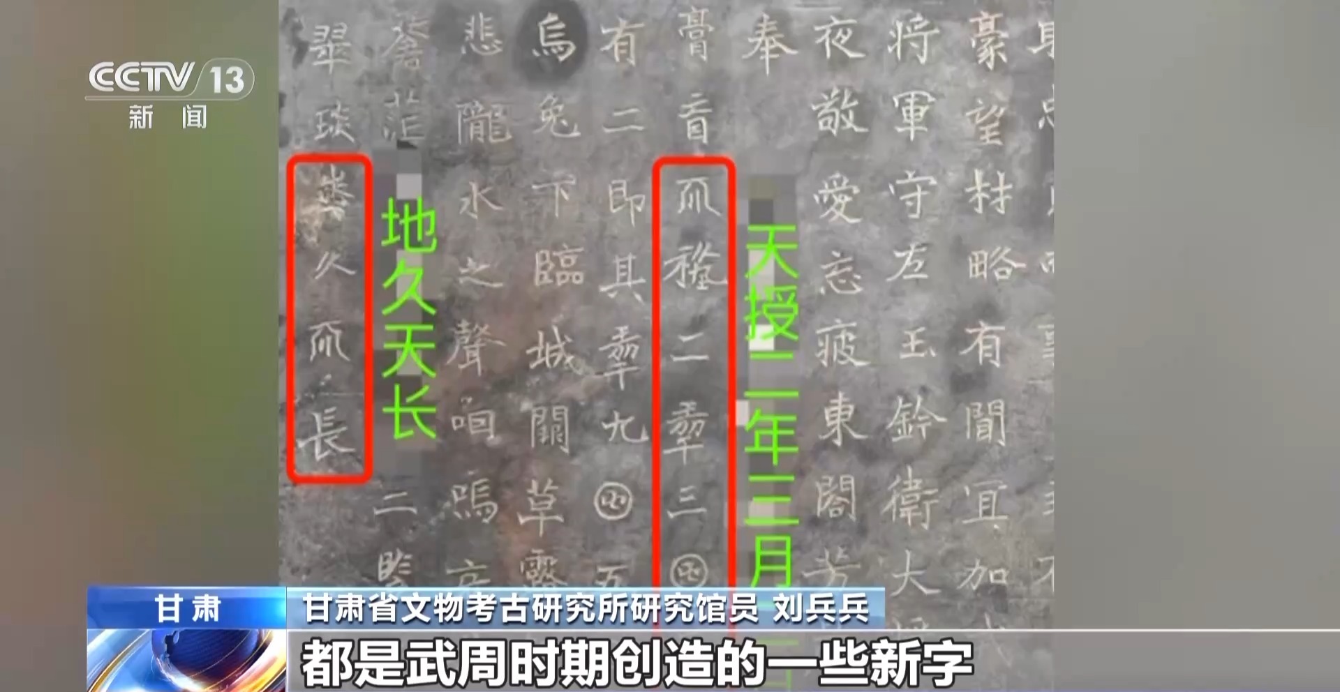 甘肃省文物考古研究所研究馆员 刘兵兵:这一方墓志是武则天时期就是武周时期的一个墓志,像天、授、年、月、日这些都是武周时期创造的一些新字。另外它的侧面两列的文字,突然一看这就有点像汉字,通过文献梳理的时候,我们判断它应该是吐谷浑人自己利用汉字的偏旁部首,创造的新的文字,这也是我们国内目前发现的唯一的第一例吐谷浑文。