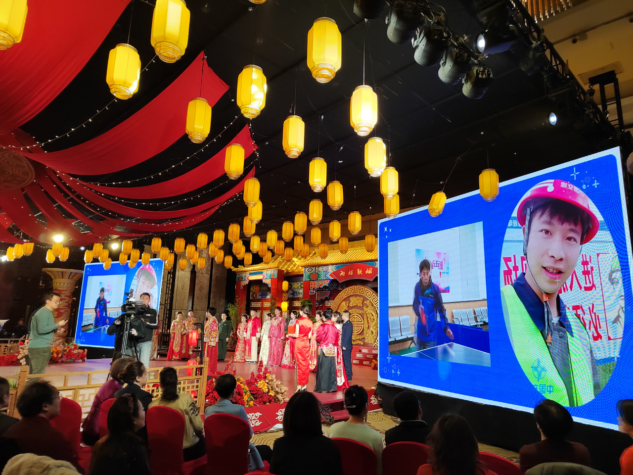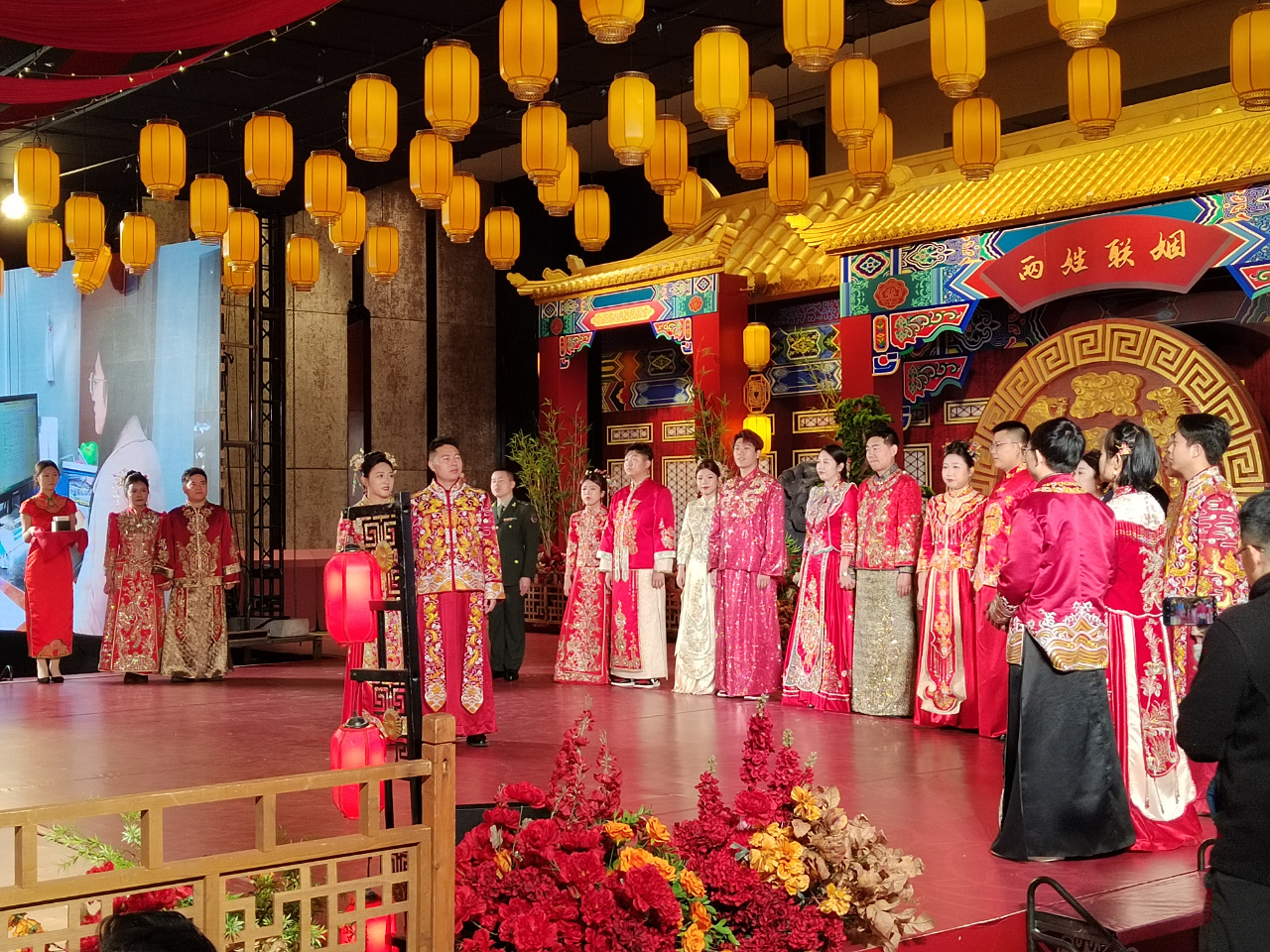 简单而不失热烈,节俭而不失隆重,秦皇岛市总工会对这次职工集体婚礼进行了精心策划。歌舞《中国龙》+灯光秀,让开场氛围一下子嗨起来。介绍新人期间,会场播放了10对新人的故事短片,走进爱人岗位,记录劳动场景,感受爱情温度。宣读婚姻誓言、赠婚书,工会领导致辞、赠送新人大礼包、共同合影等细节安排,更是把现场仪式感拉得满满。在赠婚书环节,新人们收到了当地知名书法家亲手书写的婚书,以及属于非物质文化遗产的专属新人姓名的喜字剪纸。在说感言、互赠礼物环节,新人们纷纷发表“爱的感言”,互赠岗位建功产品信物,包括亲手焊接的冬奥吉祥物,亲手制作的发簪、手环、围巾、相册等。