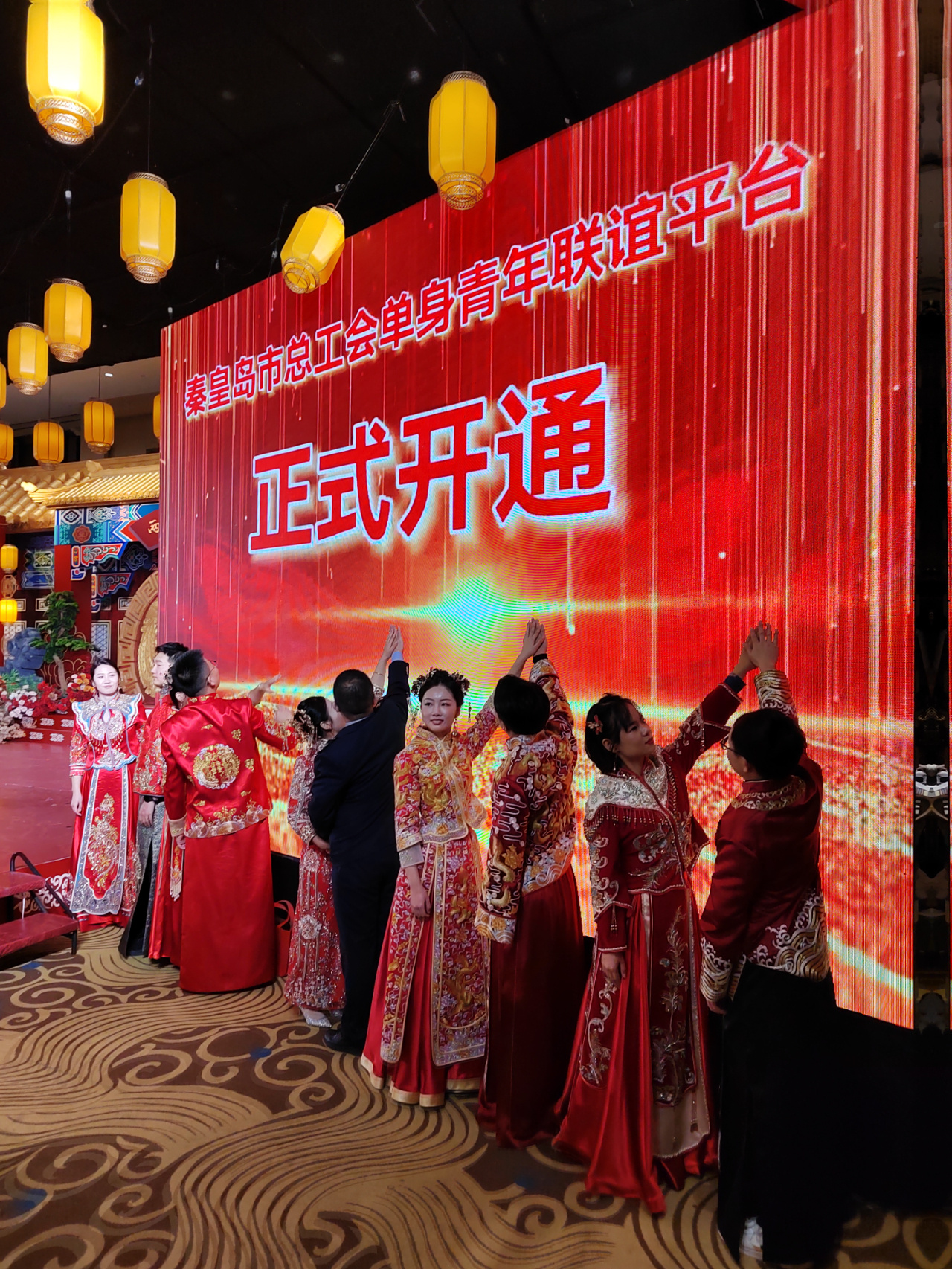 仅今年以来,全市各级工会就组织举办职工联谊活动30多场,万余名职工参与,成功牵手200余对。为进一步搭建职工线上交友平台,秦皇岛市总工会新开发了“会结良缘”单身青年联谊平台,在本次集体婚礼现场,10对新人与市总工会领导共同启动了平台上线仪式。