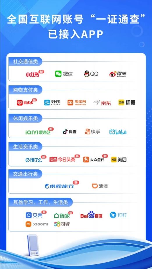 据工业和信息化部消息,自12月1日起,“一证通查”查询名下互联网账号服务新增接入今日头条、携程旅行、拼多多、饿了么、爱奇艺、小红书、大众点评、贝壳找房、链家等9款互联网APP,用户本人名下手机号码关联互联网账号的可查范围扩增至25款。
