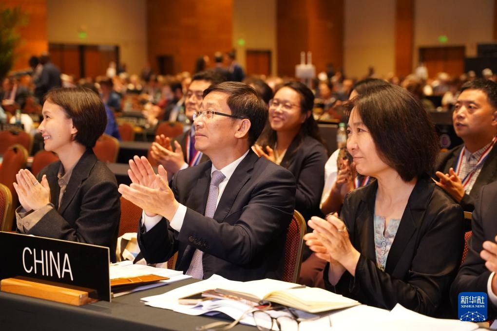 12月5日,在巴拉圭亚松森联合国教科文组织保护非物质文化遗产政府间委员会第19届常会评审现场,中国代表团庆祝。新华社记者 朱雨博 摄