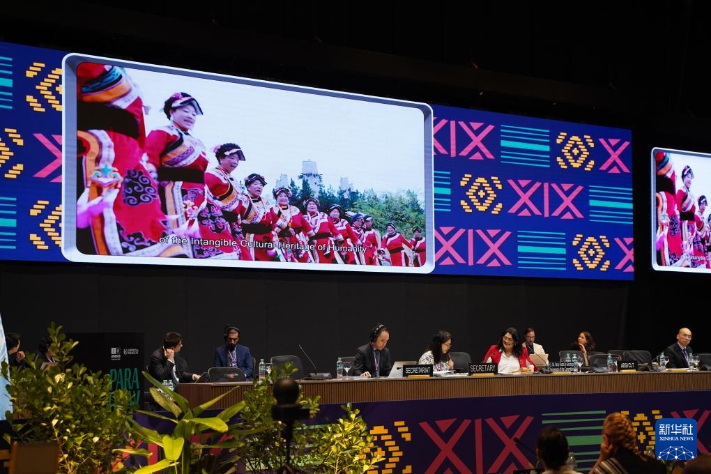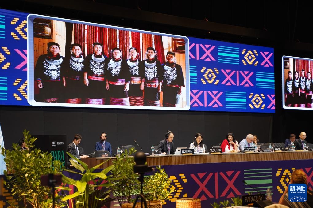 12月5日,在巴拉圭亚松森联合国教科文组织保护非物质文化遗产政府间委员会第19届常会评审现场,大屏幕播放“黎族传统纺染织绣技艺”宣传视频。新华社记者 朱雨博 摄