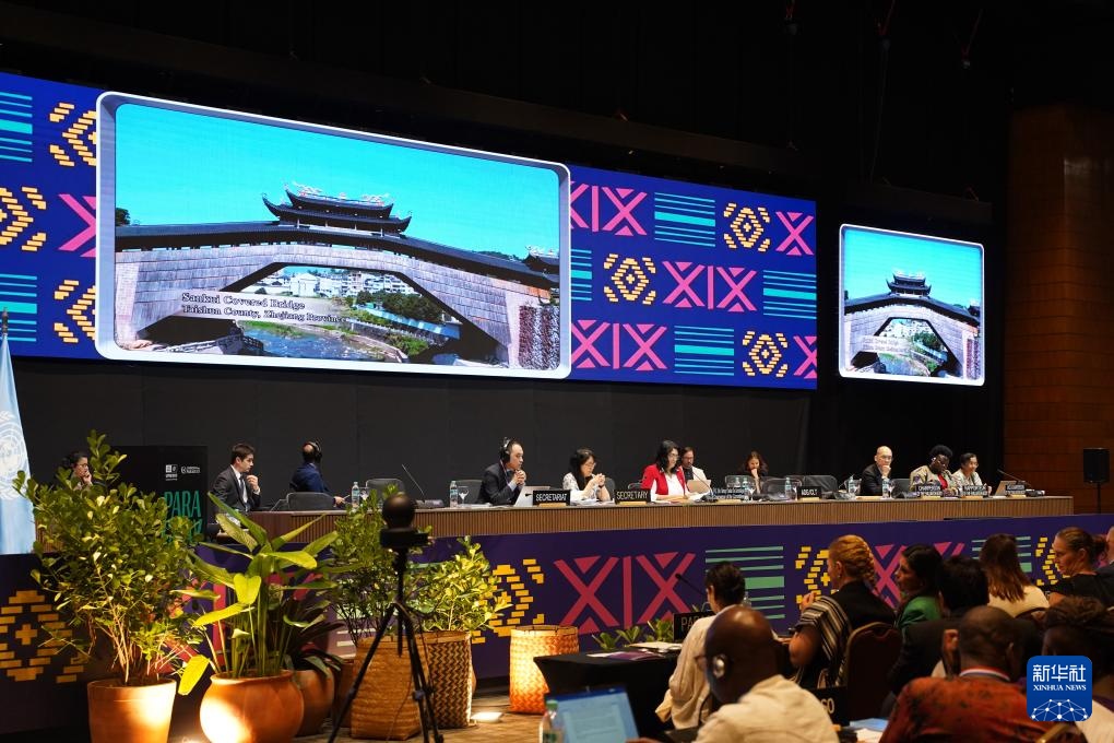 12月5日,在巴拉圭亚松森联合国教科文组织保护非物质文化遗产政府间委员会第19届常会评审现场,大屏幕播放“中国木拱桥传统营造技艺”宣传视频。新华社记者 朱雨博 摄