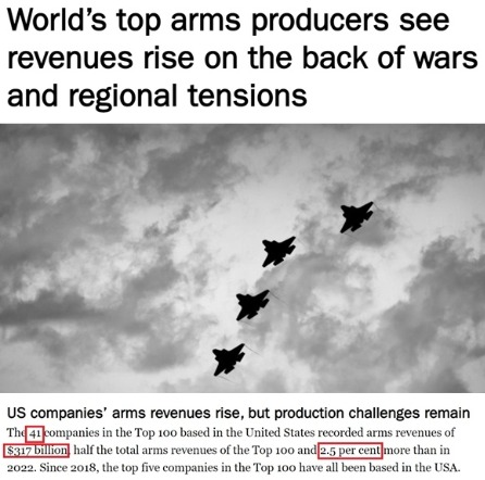 数据显示,这41家美国军工企业去年的销售收入达到3170亿美元,较2022年增长了2.5%,占到全球前100大武器制造商去年总收入的一半。