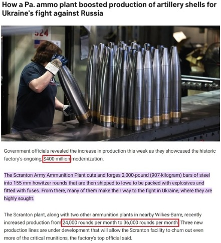 在位于美国宾夕法尼亚州的斯克兰顿陆军弹药厂,机器轰鸣作响,900多公斤重的钢条被切割、锻造加工成155毫米榴弹炮炮弹。之后,这些炮弹被运往艾奥瓦州,装上炸药并安装引信,其中大量炮弹最终都被运往乌克兰。