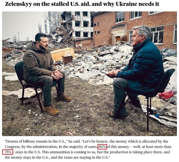 就连乌克兰总统泽连斯基也承认这一点。今年3月泽连斯基在接受美国哥伦比亚广播公司采访时坦言,美国国会和政府分配的资金,80%(至少超过75%)都留在了美国。“弹药被运到我们这里,但生产是在那里进行,钱留在了美国,税收也留在了美国。”