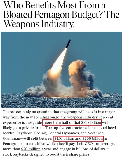 美国《国家》杂志等媒体此前的报道称,美国的军工五巨头(波音、通用动力、洛克希德•马丁、诺斯罗普•格鲁曼和雷神公司)每年能从五角大楼获得价值1500至2000亿美元的合同,占五角大楼总预算的近20%。