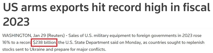 数据显示,美国2023年的海外武器销售达到创纪录的2380亿美元。在全球地区冲突不断的背景下,美国军工企业赚得盆满钵满。
