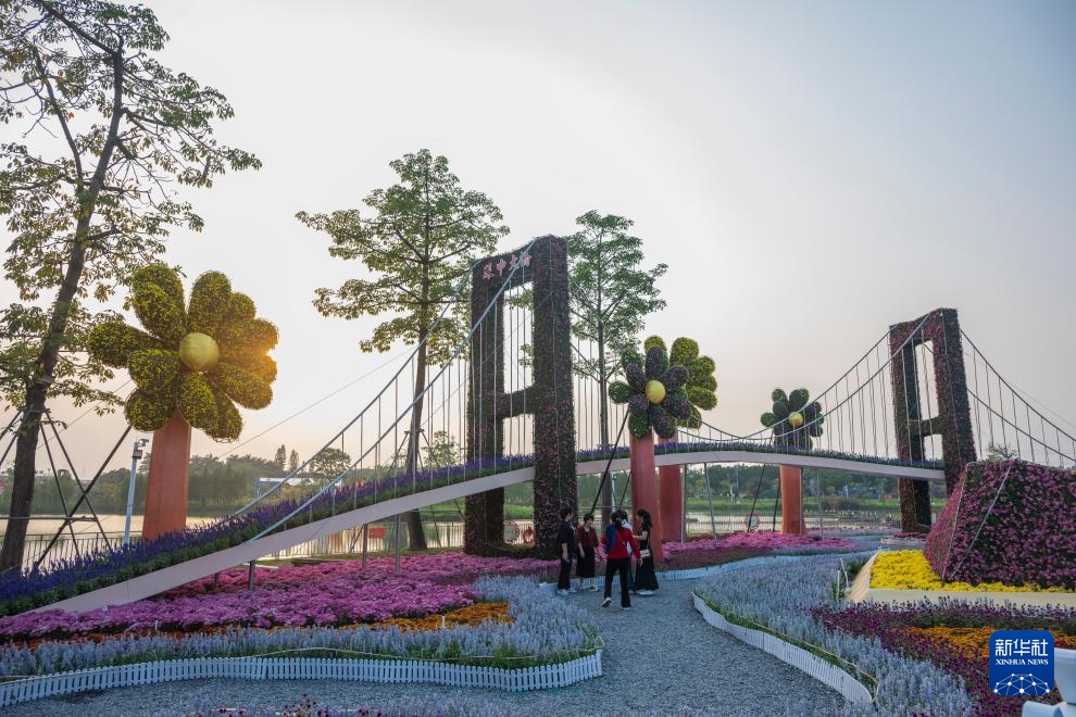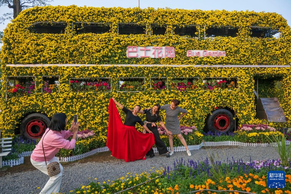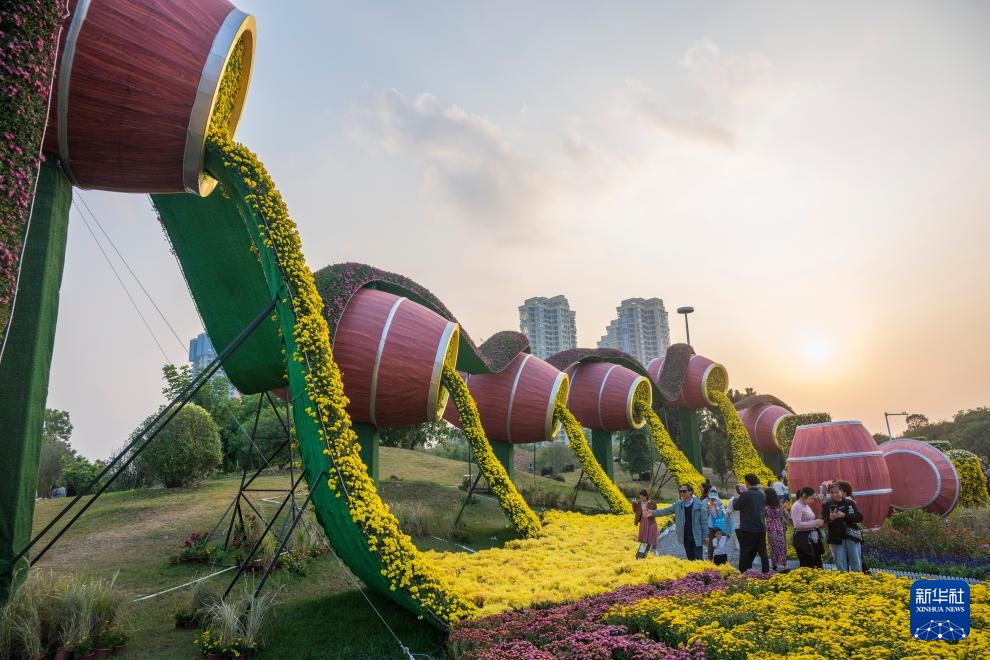 12月5日,在2024年小榄菊花会上,人们在主题菊艺造景下合影留念。新华社记者 才扬 摄