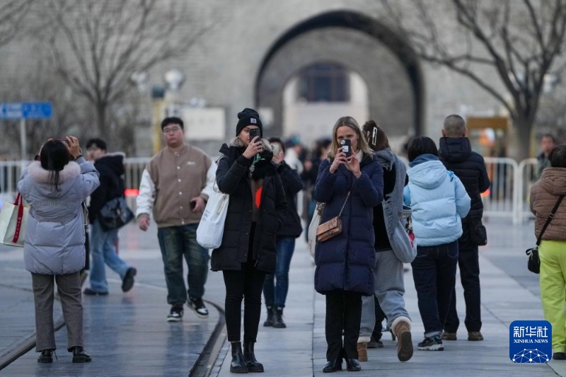 12月4日,两名来自德国的游客在北京前门大街拍照,她们还将前往上海和桂林游玩。新华社记者 鞠焕宗 摄