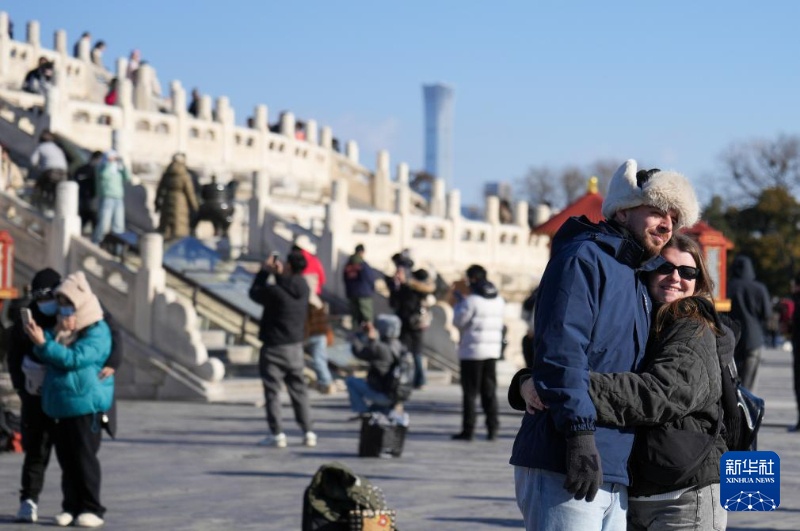 12月5日,两名外国游客在北京天坛公园合影。新华社记者 鞠焕宗 摄