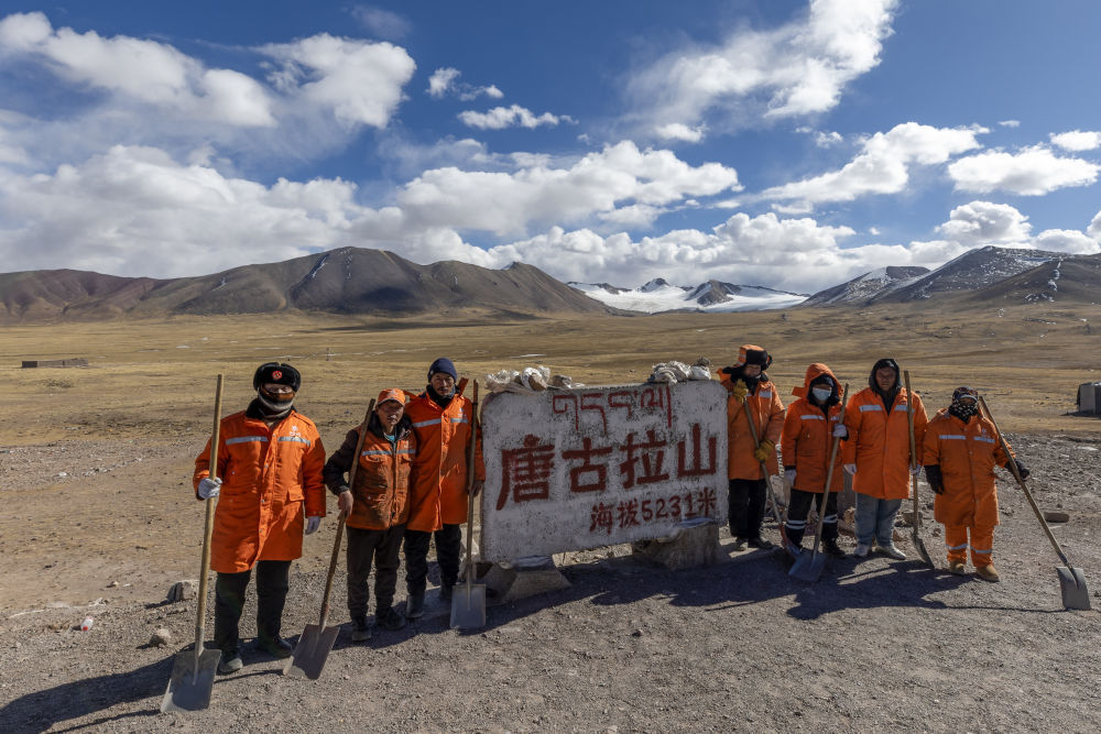记者一行到达唐古拉山口时,7名身穿橙色制服的养路工人,正在用铁锹修补路肩。尽管太阳高悬,风速却不小,用来警示隔离的锥形交通路标不断被大风吹倒,工人们不时要把它们扶正。