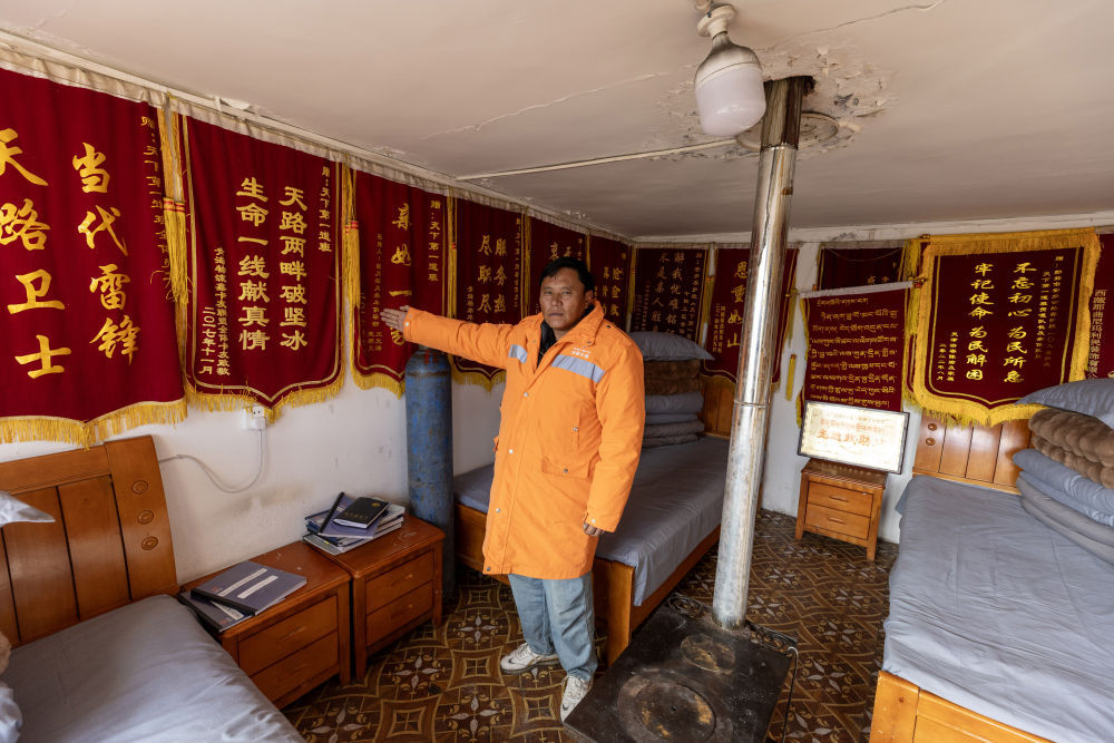 这里的救助站吸引了记者的注意。进入房间,内有床铺、氧气瓶、抗高反药等物品,四面墙上挂满锦旗。一封毛笔书写的红底感谢信格外显眼,信中表达了对地嘎、东力、次仁多吉三名养路工人的感谢。信中写道:“在那漫长的10个小时里,你们不顾危险和疲惫,想尽办法让我脱险。”