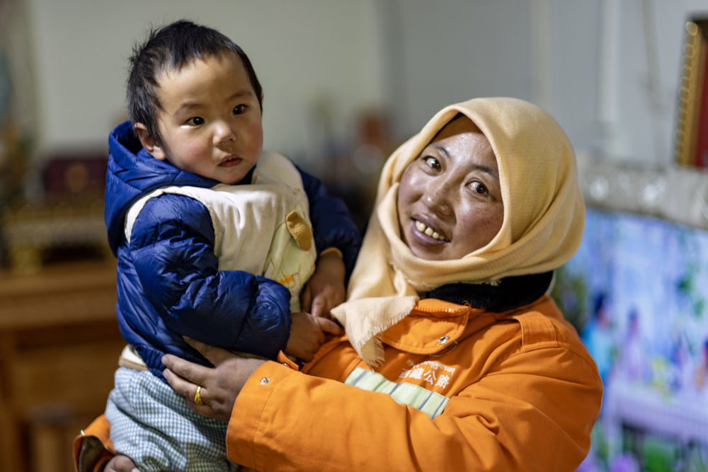 养路工人益西曲珍(右)和一岁多的儿子扎西罗布在“天下第一道班”的职工宿舍中(12月1日摄)。新华社记者 姜帆 摄