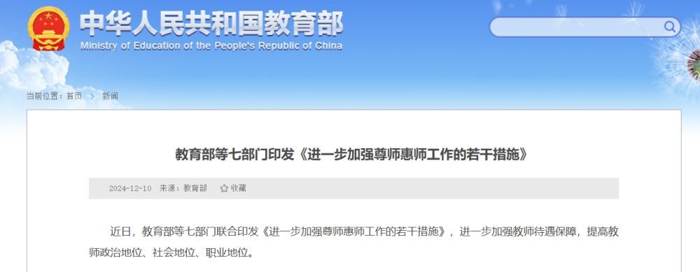 近日,教育部等七部门联合印发《进一步加强尊师惠师工作的若干措施》,进一步加强教师待遇保障,提高教师政治地位、社会地位、职业地位。