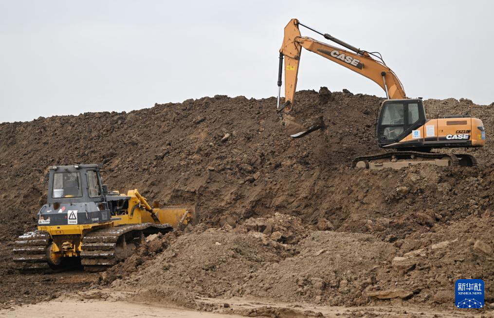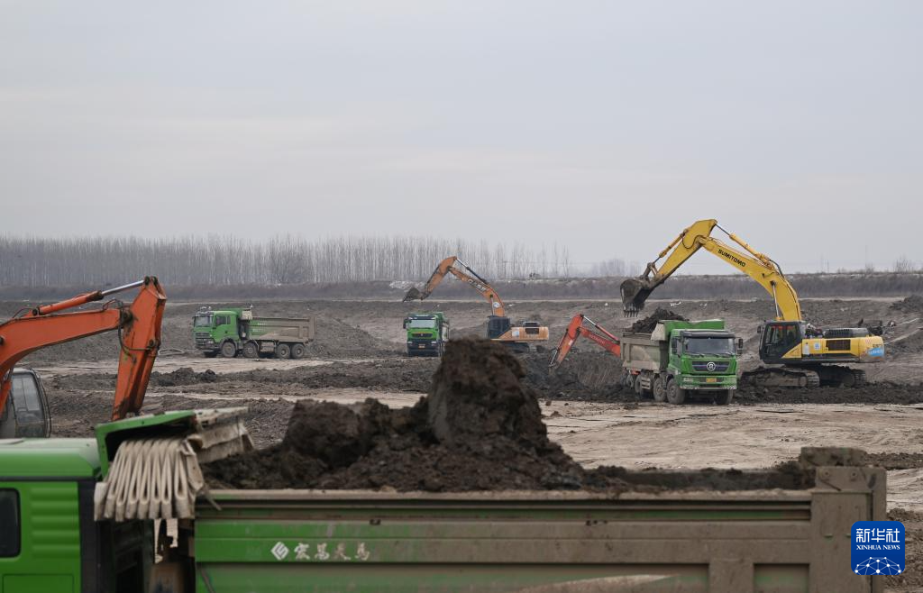 中建六局水利水电建设集团有限公司组织工程机械在大清河沿岸进行堆土作业(12月29日摄)。新华社记者 李然 摄