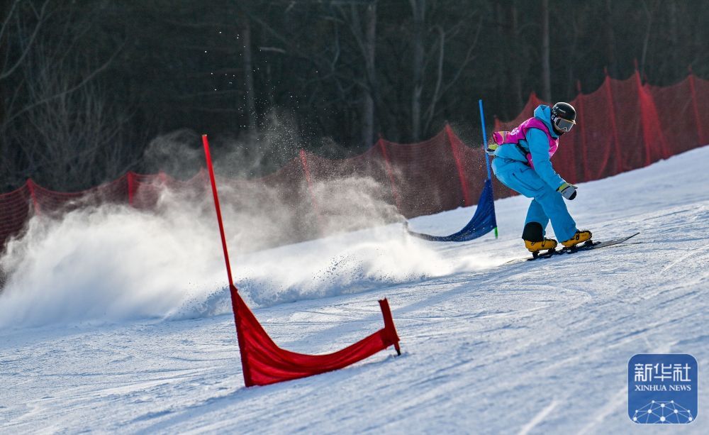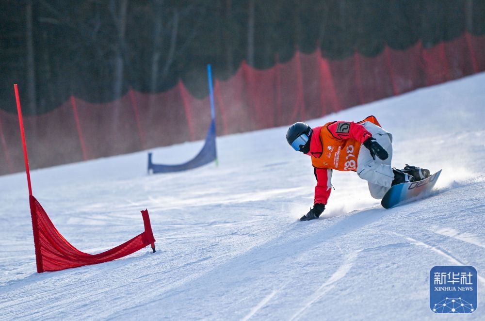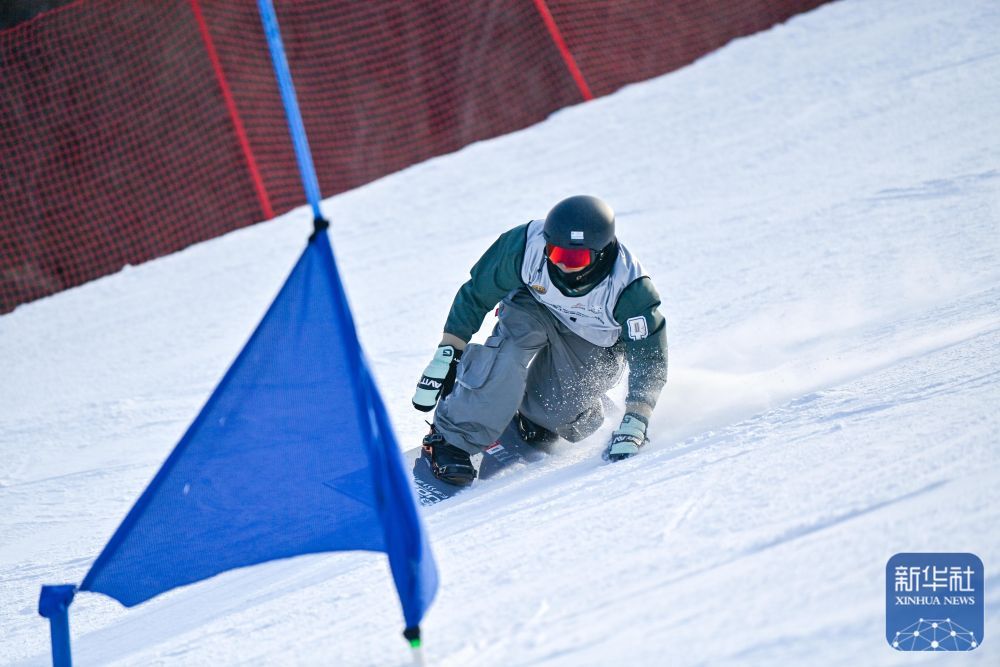 重庆市总工会选手高子尧在单板滑雪男子平行大回转项目比赛中。