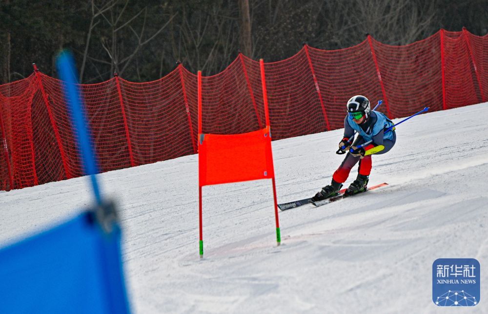湖北省总工会选手邹云在高山滑雪男子大回转项目比赛中。