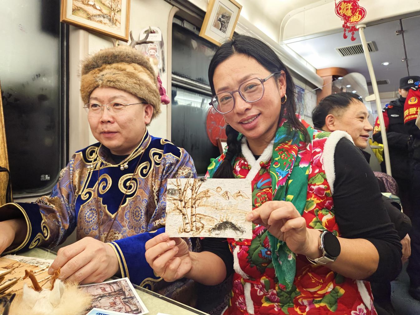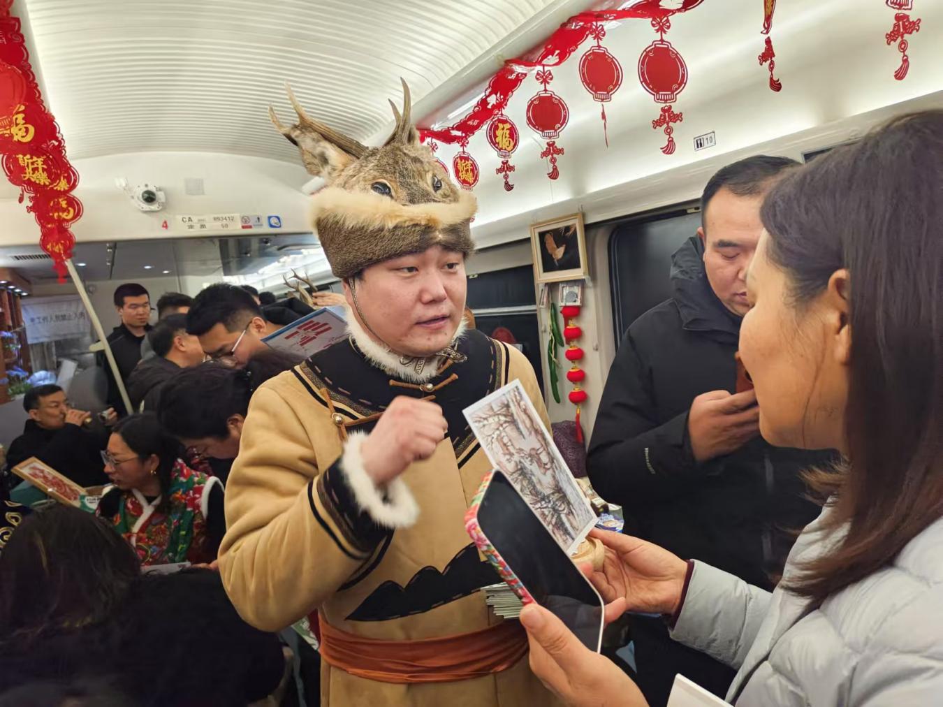 铁路部门精心打造非遗文化车厢,布置桦树皮画等宣传品,营造浓厚氛围。“今年是春节申遗成功后的首个春节,我们打造这趟非遗文化列车,准备了非遗作品和秧歌舞蹈,就是想满足旅客多元化的出行需求,让大家在乘坐雪国列车的同时,欣赏非遗表演,体验别样旅途时光。”齐齐哈尔客运段K7041次列车长石磊说。