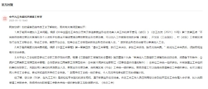 近日,网友通过人民网“领导留言板”给江西省九江市委书记留言,咨询加入工会的二三事。