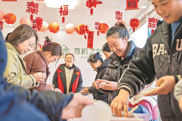 1月15日,浙江省湖州市长兴县传化公路港司机驿站,货车司机家属、户外工作者一起包水饺、品年味。
