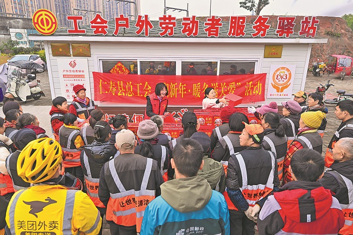 1月15日,在四川省眉山市仁寿县城区的户外劳动者服务驿站,工会工作人员正在集中为户外劳动者发放年货大礼包。
